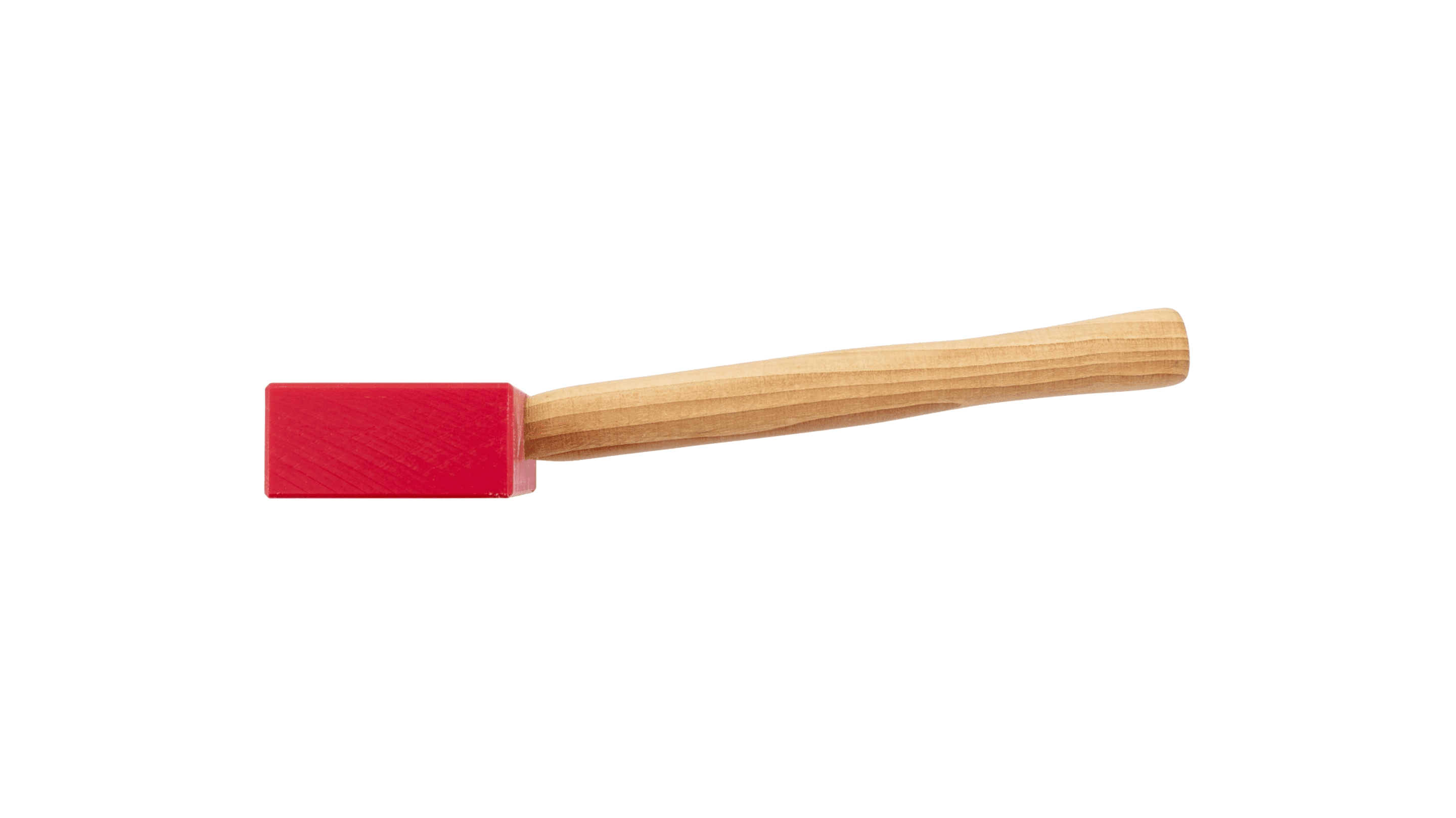 Av rød plast og vinklet skaft av hickory. Vinklet skaft motvirker slag mot knokene ved arbeid på plant tak.